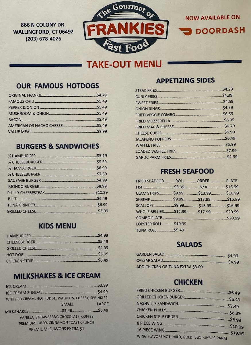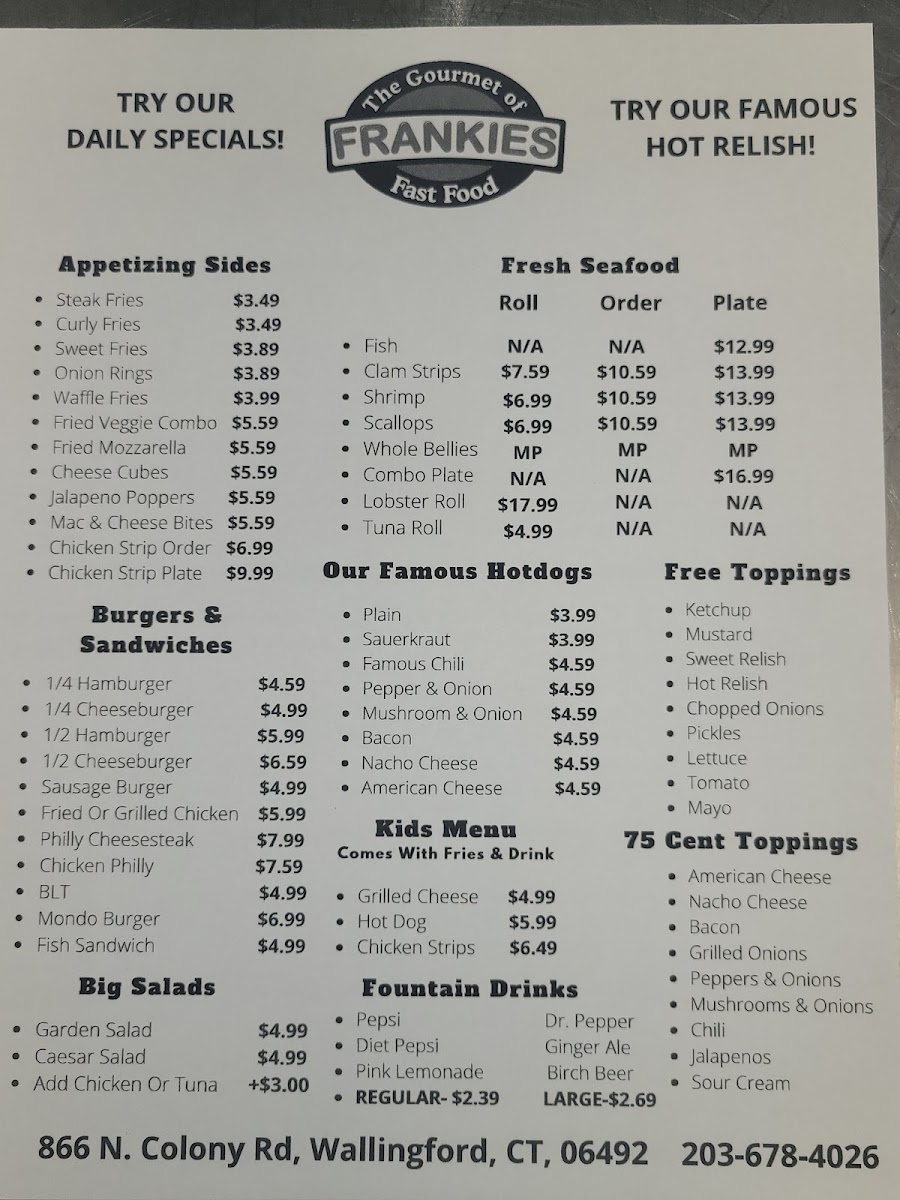 Introducing the menu at Frankies Wallingford, a cozy roadside gem tucked away at 866 N Colony Rd, Wallingford, CT. This eatery specializes in delicious and affordable comfort food that resonates with both nostalgia and flavor. Patrons rave about their classic hot dogs, which are often hailed as the best in the area, reminiscent of beloved childhood hangouts like Chicks and Jimmi’s. The menu also features crisp onion rings and quick bites that hit the spot for anyone on the go.